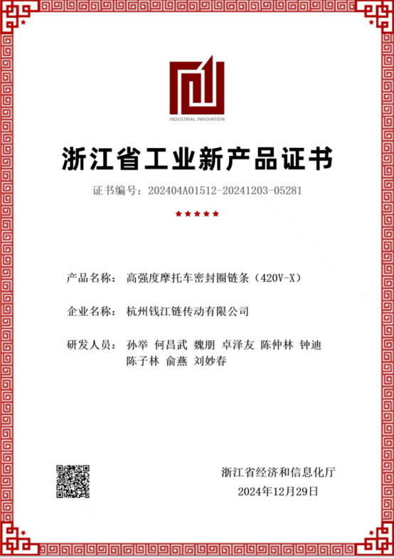 Высокопрочная мотоциклетная цепь с масляным уплотнением, модель 420V-O(X), разработанная и произведенная компанией Hangzhou Qianjiang Chain Industries Co., Ltd., прошла сертификацию новой продукции на провинциальном уровне.